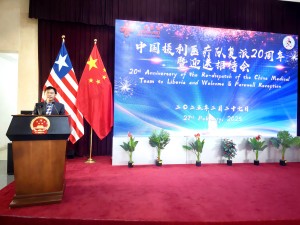 2月27日,驻利比里亚使馆举办中国援利医疗队复派20周年暨迎送招待会。尹承武大使、利卫生部长波托、黑龙江省卫健委金剑处长分别致辞,第16、17批医疗队队员、利卫生部、JFK医疗中心等100余人出席。